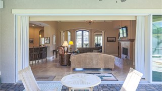 Located between a quiet cul-de-sac and the 16th green of the Tom Fazio South Course, this home offers 4 bedrooms, 4.5 baths, and multiple living spaces. The great room features a vaulted wood-paneled ceiling, telescoping doors, and a fireplace. A climate-controlled wine cellar stores up to 500 bottles. The dining room sits in a rounded architectural nook with custom millwork, while the private office features a tray ceiling. The kitchen includes granite counters, center island, dark oak cabinets, and a five-burner gas range. Three guest suites include private baths; one has lanai access. The primary suite offers two custom walk-in closets and a spa-like bath with garden tub, large shower, and dual vanities. Outdoor living includes a screened lanai, kitchen, fireplace, spa, and freeform pool. The 2-car garage includes golf cart space and leads to a laundry room with storage. An exceptional value in Berkeley Hall. This home is a must-see.