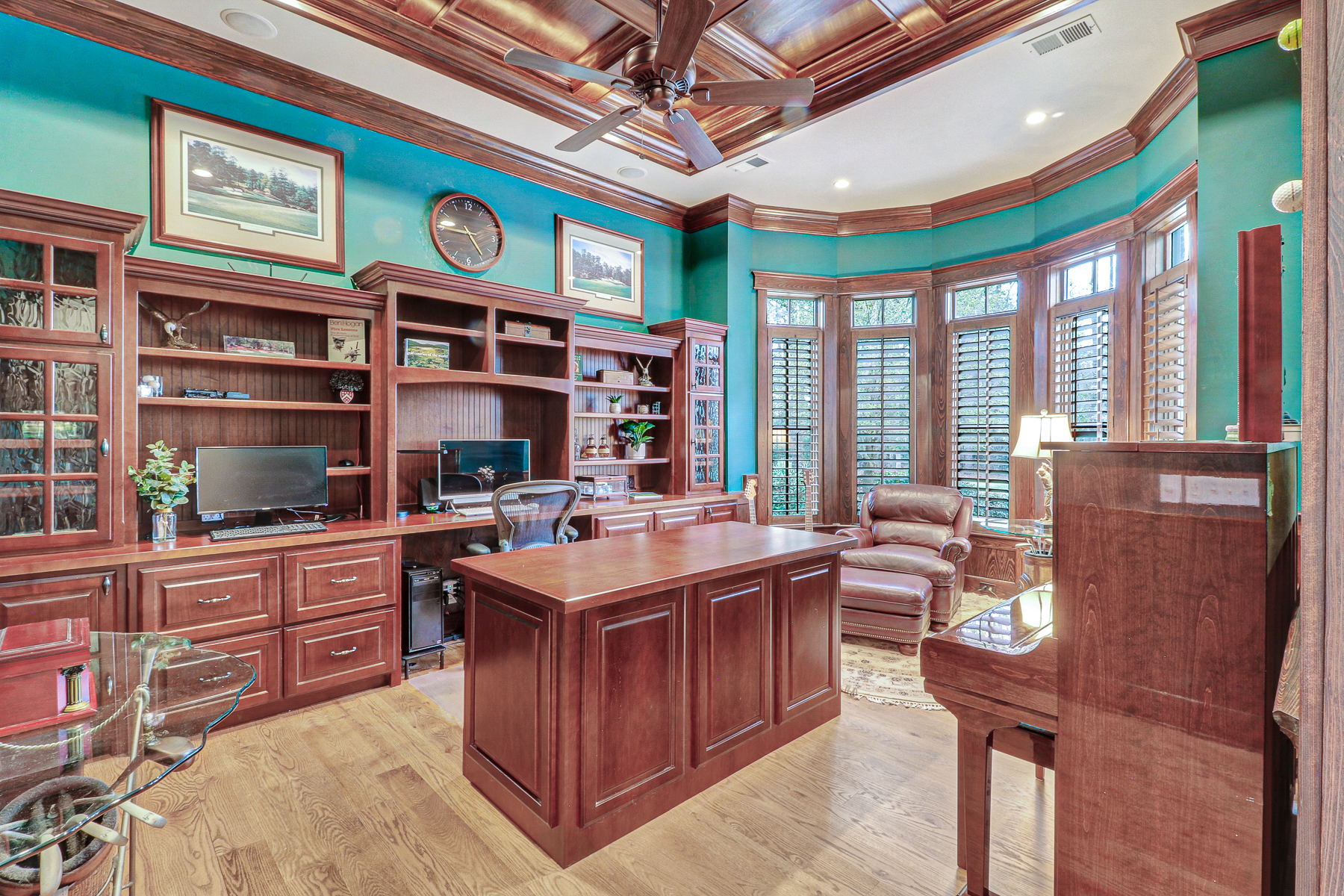 An utterly stunning transformation of this custom estate in Berkeley Hall, arguably one of the premier gated golf communities in the Lowcountry. Desirably located within the community and offering sunrise vistas across the 9th hole of the south course, this estate presents refreshingly updated spaces throughout. Having undergone an extensive renovation in 2023, 74 Lancaster Boulevard in Berkeley Hall is truly in mint condition. With over 5300 square feet of luxurious appointments and superior construction quality throughout the home, no detail nor expense was spared in the recent transformation. Custom interior design and meticulous attention to detail are prevalent at every turn. From the Sub-Zero appliances and coveted Wolf range to the cutting-edge wet bar, well-equipped interior butler's pantry, dry goods storage pantry, and outdoor catering kitchen; the opportunities for food preparation and entertaining favored guests are endless. The success in transforming the owner's suite is evident upon entry with newly installed plantation shutters filtering the sunlight as needed in the sitting area, appropriately offset from the dedicated bedroom itself. The extremely well designed owner's bath is filled with natural light and provides an access point to the walk-in closet wherein floor-to-ceiling custom closet systems and cabinetry can be found. Also located on the main floor of the estate are: a most handsome owner's study, complete with custom built-in cabinetry, an expansive great room, spacious dining room, Carolina room adjacent to the kitchen, newly refreshed laundry facilities, half bath, and two separate stairwells leading to additional living arrangements up above. The second floors of the home consist of two separate living spaces, four guest rooms to include a bunk room, an in-home gym, half bath, and covered balcony overlooking multiple fairways of the award winning Tom Fazio-designed south course. Below, the newly landscaped outdoor oasis with pool presents an opportunity to enjoy the temperate Lowcountry climate regularly. An additional favored feature is the screened-in porch equipped with brick ensconced gas-operated fireplace providing a year-round outdoor haven to enjoy.
